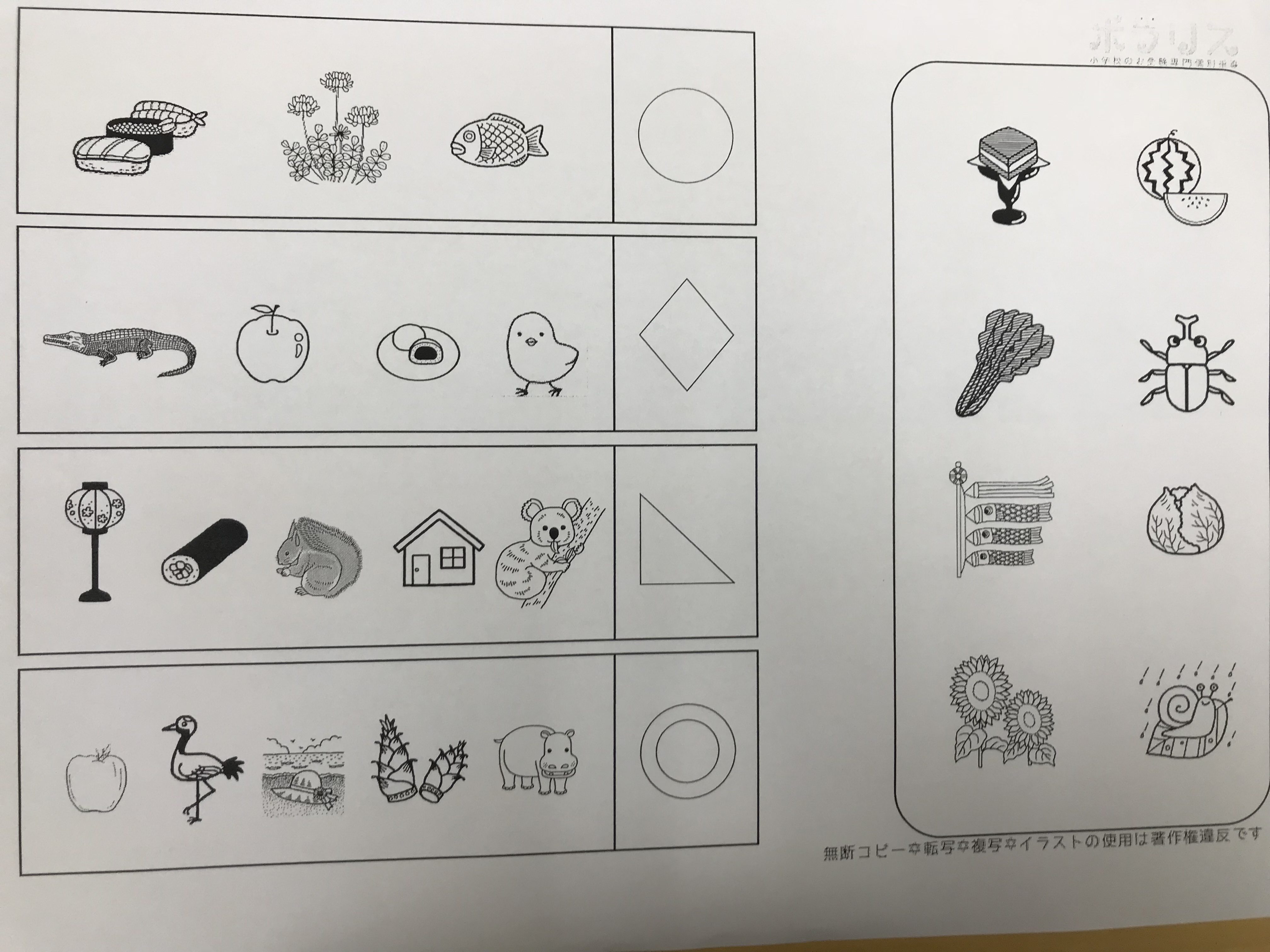★上の四角の絵の言葉の音を使ってできているものを下から見つけて◯をしましょう。