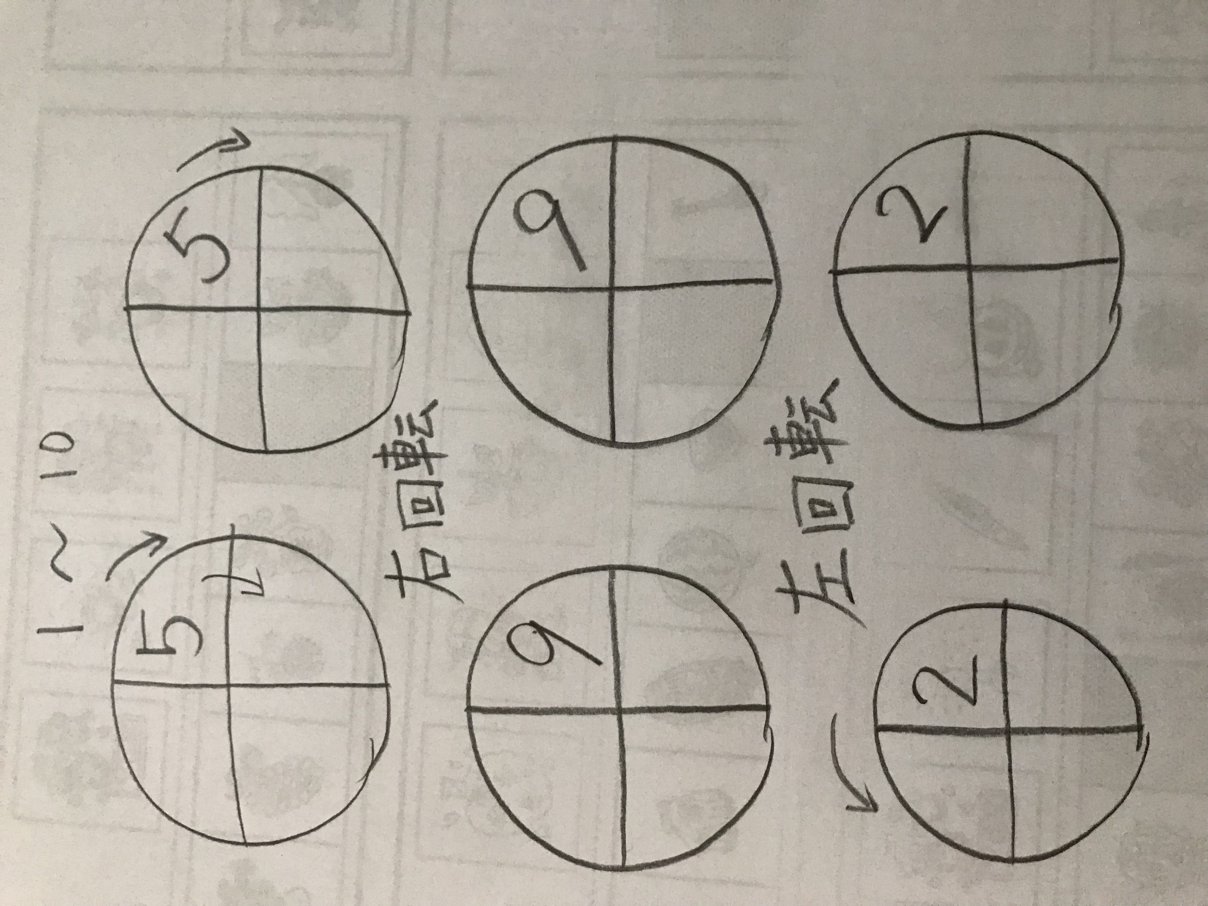 上の数字が回転するとどう変わっていくか!を書かせてます。